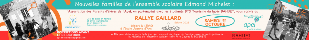 L’équipe de l’Apel Edmond Michelet (Association des Parents d’élèves) est très heureuse de vous convier à son traditionnel Rallye Gaillard que nous organisons chaque année, en partenariat avec le lycée BAHUET, pour les nouvelles familles de l’ensemble scolaire !
