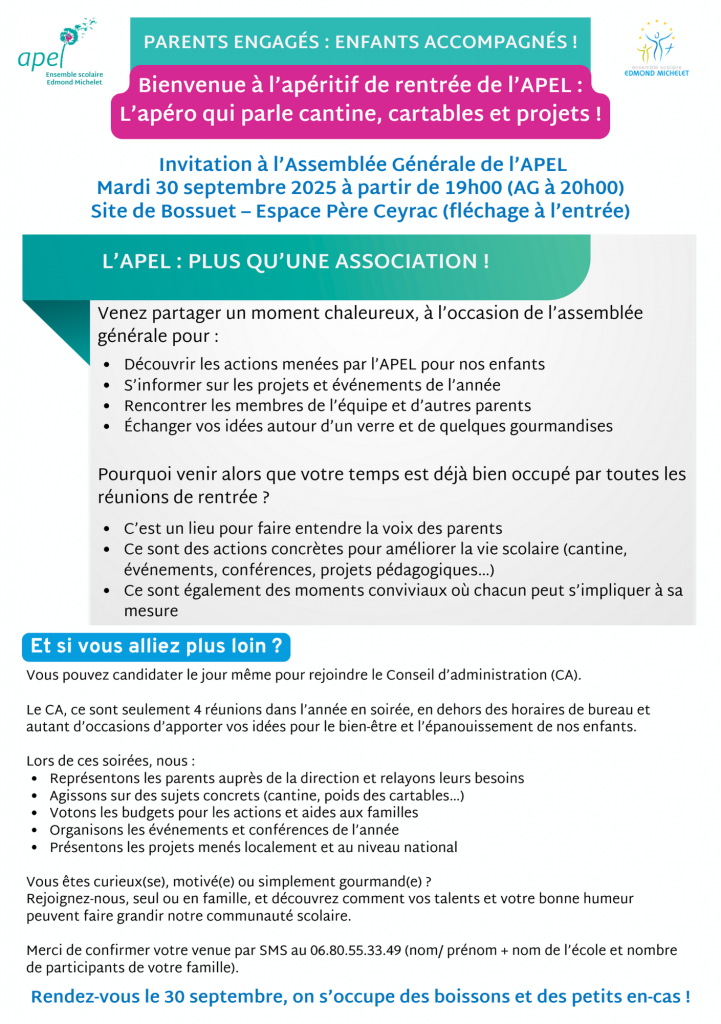 Mardi 30 septembre prochain à l’espace Père Ceyrac à Bossuet, à 19h00 se déroulera l’apéritif de rentrée de l’Apel Edmond Michelet, suivi de l’Assemblée Générale à 20h00.