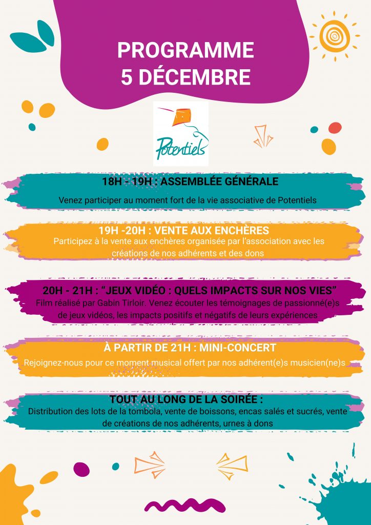 Au programme de cette soirée, précédée de l’Assemblée Générale Ordinaire, nous vous proposons une vente aux enchères de créations artistiques, le film « Jeux vidéo : quels impacts sur nos vies » réalisé par l’Association, des rencontres, des échanges, de la musique, et surtout, le plaisir de partager un moment chaleureux autour d’une belle cause.